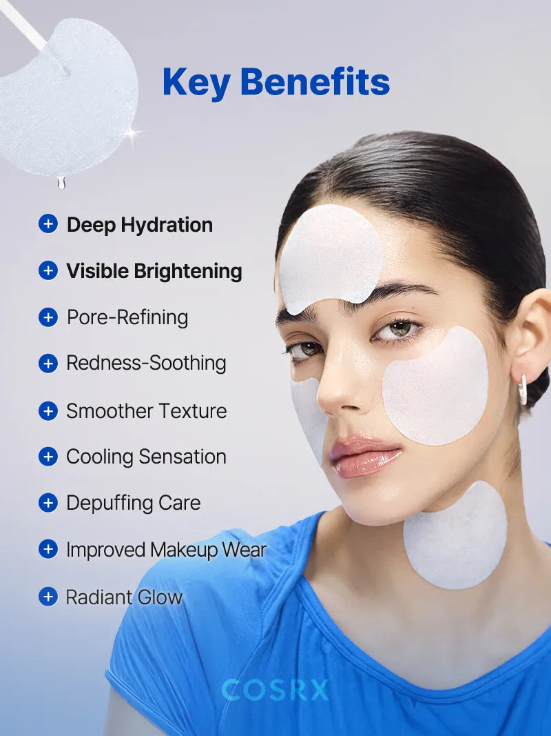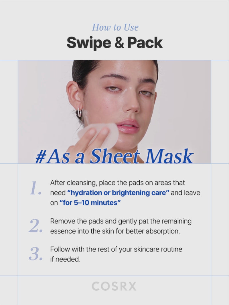 * 70mm oversized pads soaked in 230mL (7. 77 fl. oz.) of essence — one of the highest volumes in its category for generous, long-lasting care.